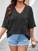 Elevate your everyday wardrobe with our Plus Size V-Neck Ribbed Knit T-Shirt. Designed for comfort and style, this oversized t-shirt offers a flattering fit while ensuring all-day wearability. With its ribbed texture and practical pocket detailing, it’s perfect for casual outings or lounging at home.