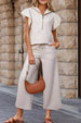 Elevate your wardrobe with our Textured Ruffled Sleeve Zipped Top and Wide Leg Pants Set. This stylish ensemble is perfect for any occasion, whether you're dressing up for a night out or keeping it casual during the day. With a modern design and comfortable fit, this two-piece set is designed to make you look and feel your best.